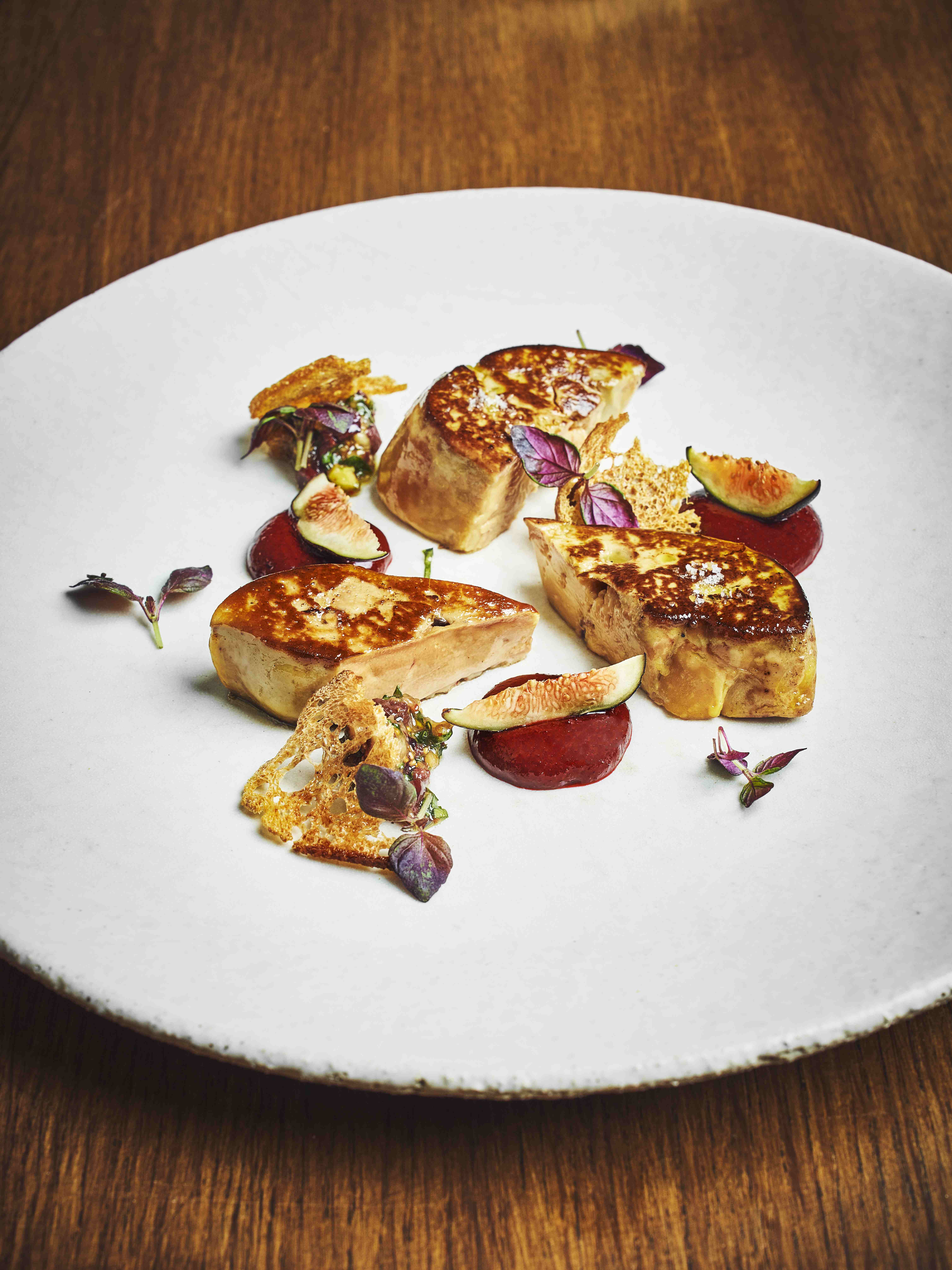 - Place the Foie Gras slice on top of the fig mixture, garnish with the baguette crisps and a few oxalis shoots.